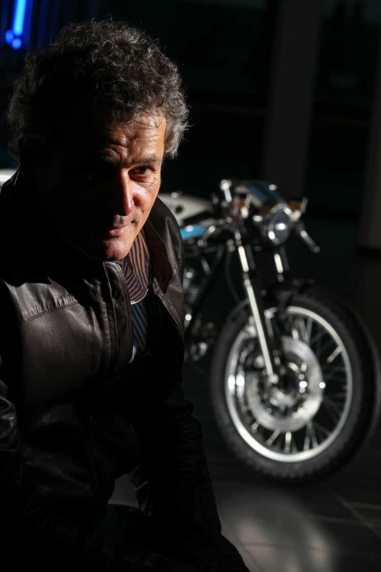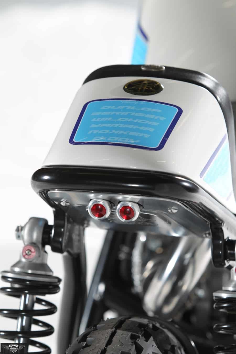 « D’un commun accord avec Bernard, je suis parti dans l’esthétique et l’esprit racing des années ’70, un hommage à la célèbre lignée TZ de chez Yamaha et tout à fait fidèle à la carrière de Bernard. Nous avons gardé des teintes bleues (les couleurs de Bernard). Afin de compliquer un peu le petit monocylindre, je lui ai ajouté un compresseur Aisin 300 qui lui donne un caractère plus trempé. »