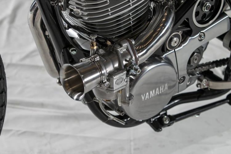 Rétrécissement et allongement du réservoir d’origine, « frenchage du bouchon », fabrication d’une selle « tapecul » en tôle intégrant l’allumage ,les composants électriques et la batterie d’origine. Ajout d’une boucle de cadre en tube et modification de la partie arrière. Nettoyage des soudures , modification du « T » de fourche et fabrication d’un guidon, ajout de deux garde-boues et acier, enlèvement de l’injection ; remplacée par un carbu S&S diamètre 48 mm, compresseur volumétrique Aisin 300, plénum chamber , ajourage du tambour arrière , commodo Beringer, embrayage hydraulique , poignée Motogadget (et compteur) fabrication de repose-pied et sélecteur dans la même esthétique. Usinage du volant moteur et d’une poulie pour entrainer le compresseur via une courroie. Polissage fourche, »T » de fourche supérieur, échappement inox(sur mesure avec sortie type Moto GP), tubulure d’admission!