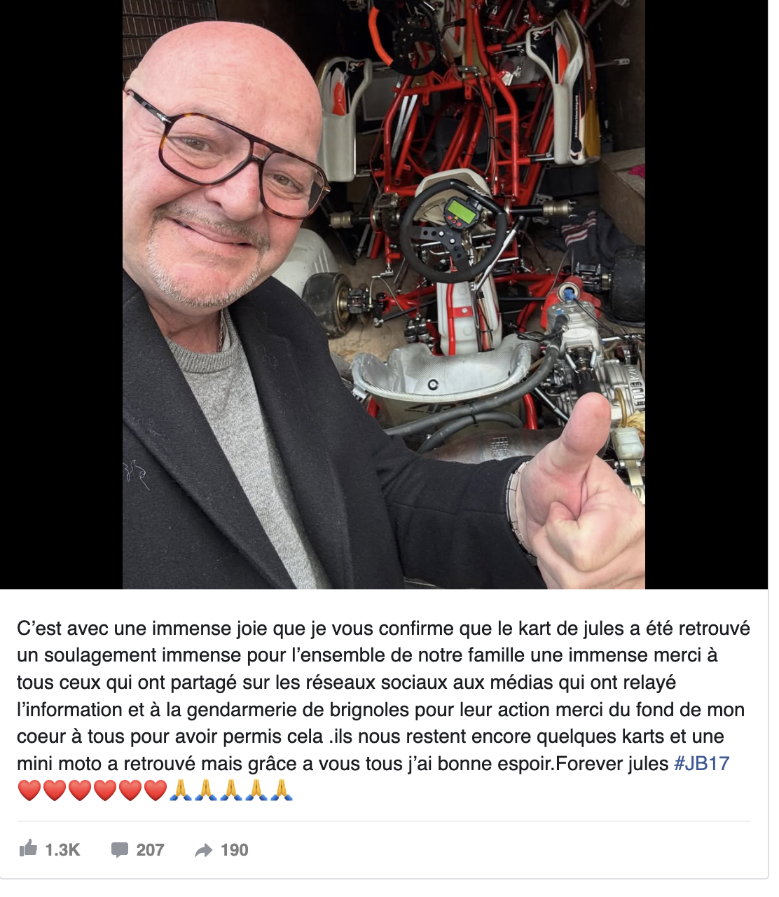 « C’est avec une immense joie que je confirme que le kart de Jules a été retrouvé. Un immense soulagement pour toute notre famille. »