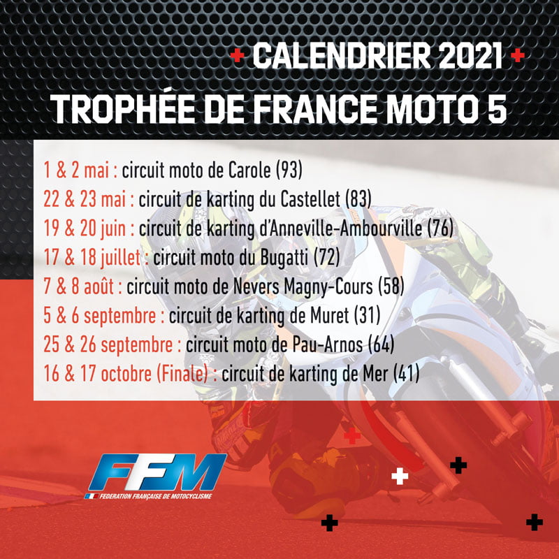Dans l’optique de dynamiser cette nouvelle catégorie et de créer de l’émulation au sein de la nouvelle génération, la Commission Nationale de Vitesse de la FFM associe à cette nouvelle catégorie Moto 5 un Trophée de France. La série comportera huit dates réparties de mai à octobre : quatre dans le cadre des Coupes de France Promosport et quatre sur des pistes de karting. En évoluant en alternance sur des circuits variés en longueur et largeur, les jeunes pousses pourront ainsi prendre progressivement leurs repères pour une adaptation plus rapide à la catégorie supérieure représentée par le Championnat de France Pré-Moto 3 Objectif Grand Prix (OGP), constitué exclusivement de « grands circuits ».