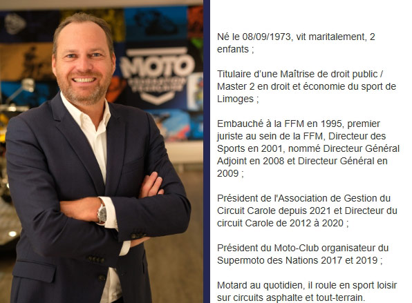 Sébastien Poirier, Président de la FFM : « Je tiens à remercier nos Moto-Clubs, nos Comités Départementaux et nos Ligues Motocyclistes Régionales pour la confiance accordée. Cette réélection vient saluer le bilan de cette première mandature entamée en pleine crise sanitaire.