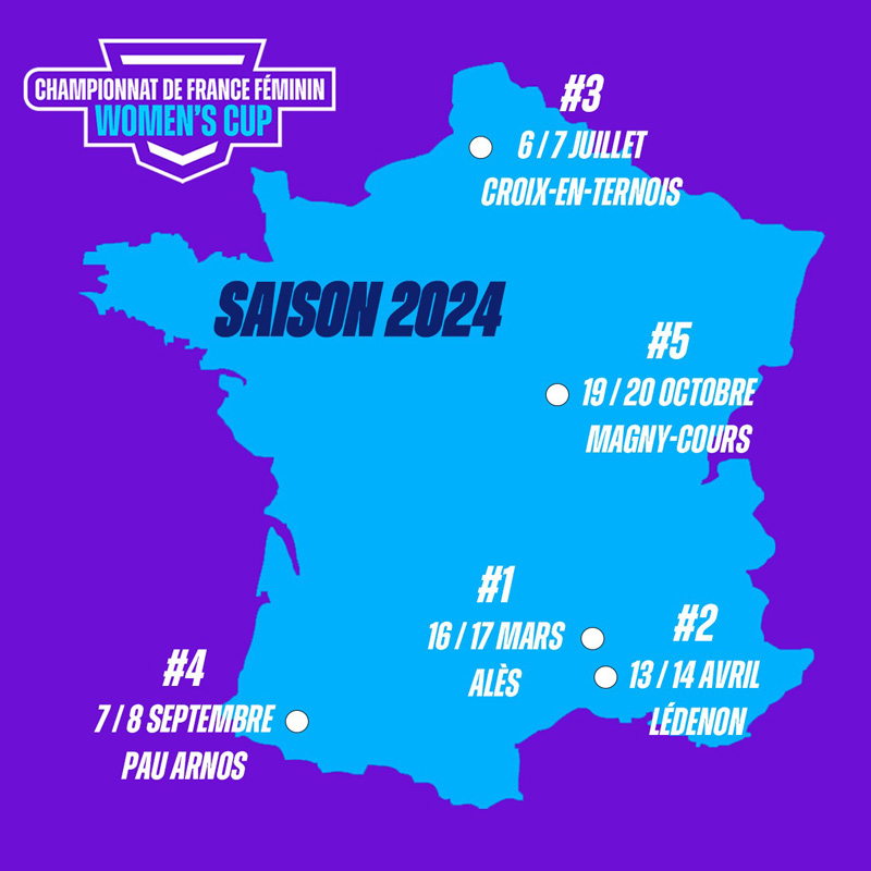 La saison 2024 sera composée de 5 dates sur des circuits emblématiques de l’Hexagone : Alès, Lédenon, Croix-en-Ternois, Pau-Arnos et Magny-Cours. Pour participer, la pilote devra être titulaire d’une licence NCO délivrée par la FFM et valable pour l’année en cours (ou d’une licence « une manifestation » pour un engagement à la course).