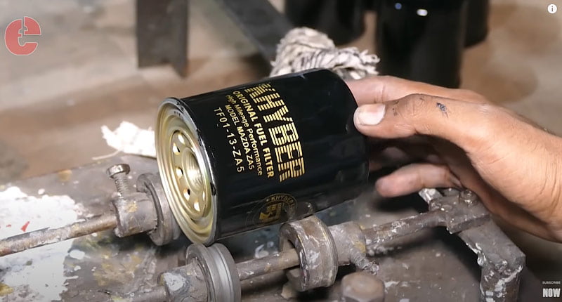 Cette fois, en provenance d’un pays indéterminé mais sans doute pas loin, ce sont des filtres à huile qui sont mis en lumière, et pas seulement à cause du manque total de sécurité pour les habiles ouvriers: vous êtes entièrement libres de croire la sérigraphie » Filtre à essence original, performance pour gros kilométrage »…