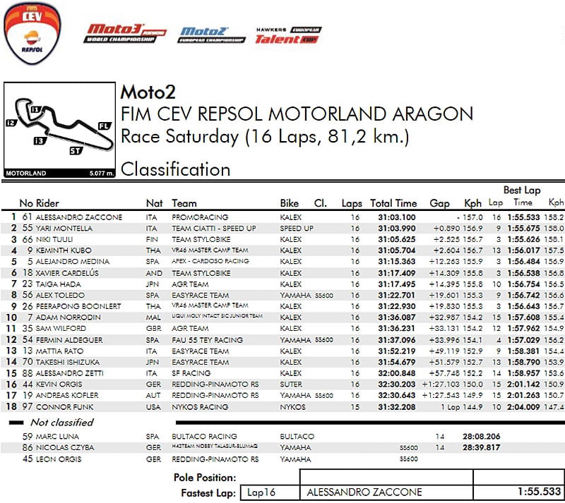 Alessandro Zaccone (Kalex, Promoracing) a parfaitement exploité sa pole position pour conserver la tête devant Keminth Kubo (VR46 Master Camp Team),  Niki Tuuli (Team Stylobike) et le leader du championnat, Yari Montella (Team Ciatti – Speed Up).