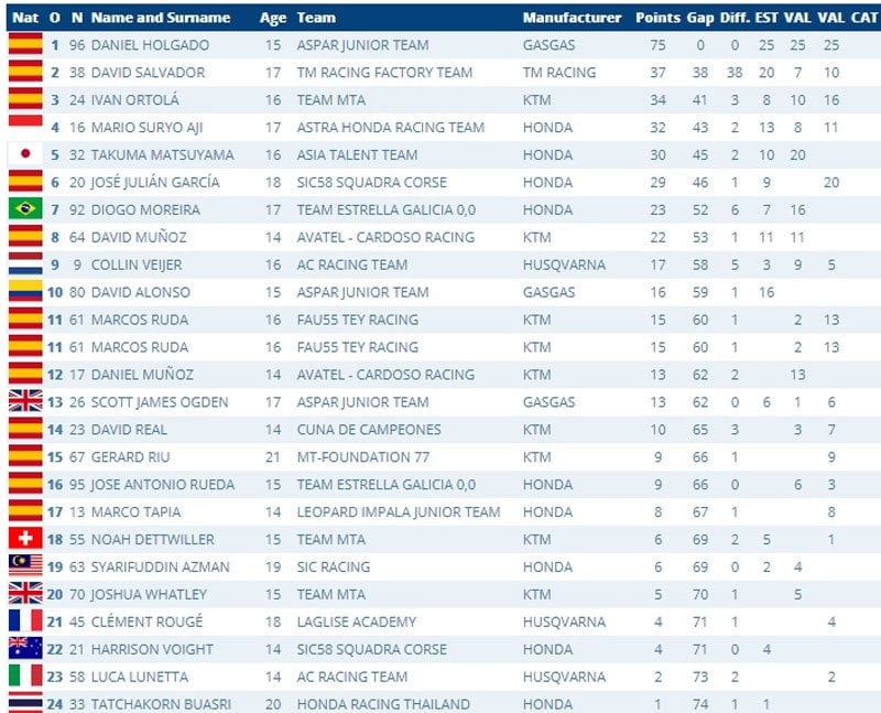 En arrivant en Catalogne, Daniel Holgado (GasGas, Aspar Junior Team) est dans une situation parfaite avec 75 points acquis grâce à 3 victoires consécutives, 38 points devant David Salvador (TM Factory Racing Team) en deuxième position. Ivan Ortola (KTM, Team MTA) en troisième position et l’Indonésien Mario Aji (Astra Honda Racing Team) en quatrième position suivent à distance avec 34 et 32 points.