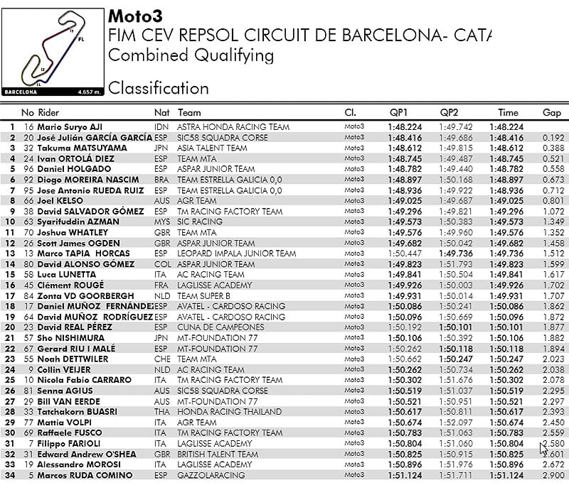 L’Indonésien est avéré deux dixièmes plus rapide que Jose Julian Garcia (Honda, SIC58 Squadra Corse), les deux pilotes ayant réalisé leur meilleur temps en QP1 plus tôt et plus frais dans la journée. C’était d’ailleurs le cas pour la quasi unanimité des pilotes, le soleil chaud de l’après-midi ayant entraîné des conditions de piste légèrement grasses en QP2. Takuma Matsuyama (Honda, Asia Talent Team) s’aligne en 3ème position, toujours sur un bon trend après avoir décroché son premier podium à Valence.