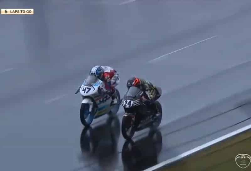 Rapidement 2 hommes se détachent sur la piste mouillée, Ivan Ortola (Sama Global Angel Nieto Team) et Diogo Moreira (Talent Team Estrella Galicia 0,0). Derrière, le peloton est emmené par Fenton Harrison Seabright (Wilsons) et on remarque la belle 7e position du Français Clément Rougé (Équipe de France – Filière GP) qui s’était qualifié seulement 28e.