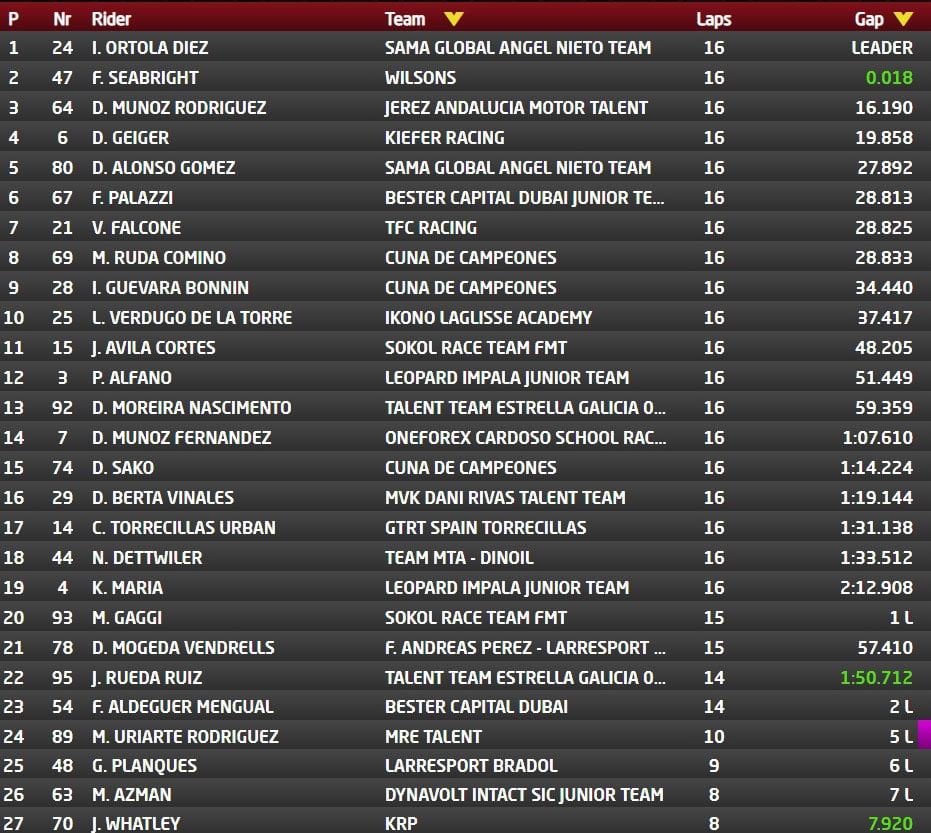 Dans ces conditions très désagréables, les derniers tours sont longs mais Fenton Harrison Seabright (Wilsons) en profite pour remonter sur Ivan Ortola (Sama Global Angel Nieto Team) et faire la jonction à 6 tours du drapeau à damier, au moment où Marcos Uriarte Rodriguez (MRE Talent), qui occupait la 3e position, part à la faute. Celle-ci est alors occupée par David Munoz Rodriguez (Jerez Andalucia Motor Talent).