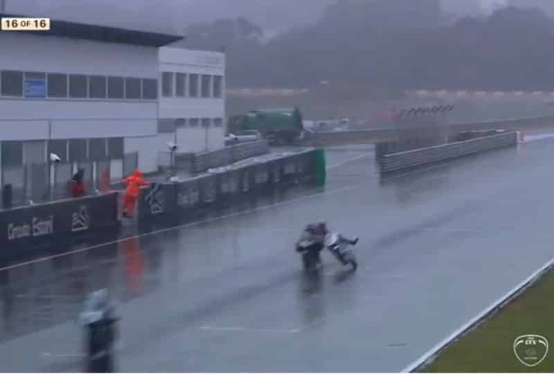 En tête, la bataille est tellement virile que Fenton Harrison Seabright (Wilsons) chute en passant la ligne d’arrivée, et la victoire revient à Ivan Ortola (Sama Global Angel Nieto Team).