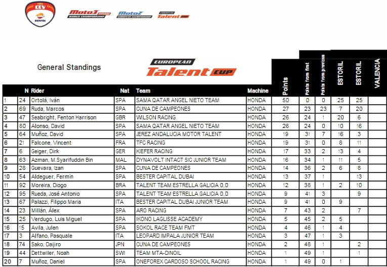 Double vainqueur près de Lisbonne, Iván Ortolá précède donc au classement Marcos Ruda (Cuna de Campeones) et Fenton Harrison Seabright (Wilson Racing), arrivés chacun d’entre eux à la deuxième position d’une des deux courses disputées.