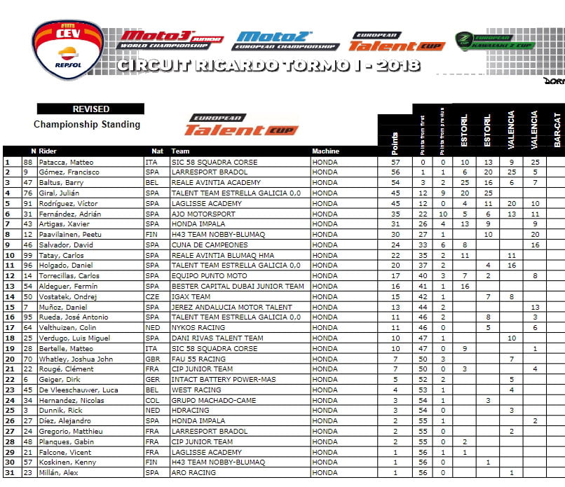Dans l’ETC (European talent Cup), les trois premiers sont séparés par seulement trois points. Matteo Pataca est la référence mais avec un seul point d’avance sur Francisco Gomez (Larresport Bradol) tandis que Barry Baltus (Reale Avintia Academy) est troisième, deux points derrière Francisco Gomez. Cependant, Barry Baltus a fait le saut en Moto3™ au Mans et ne pilotera plus en ETC. De l’égalité de cet ETC en dit long sur le fait qu’aucun pilote n’a remporté la course inaugurale à Estoril, Julián Giral (Talent Team Estrella Galicia 0.0) la deuxième course au Portugal, Francisco Gómez a gagné la première course à Valence et le leader actuel dans la deuxième.