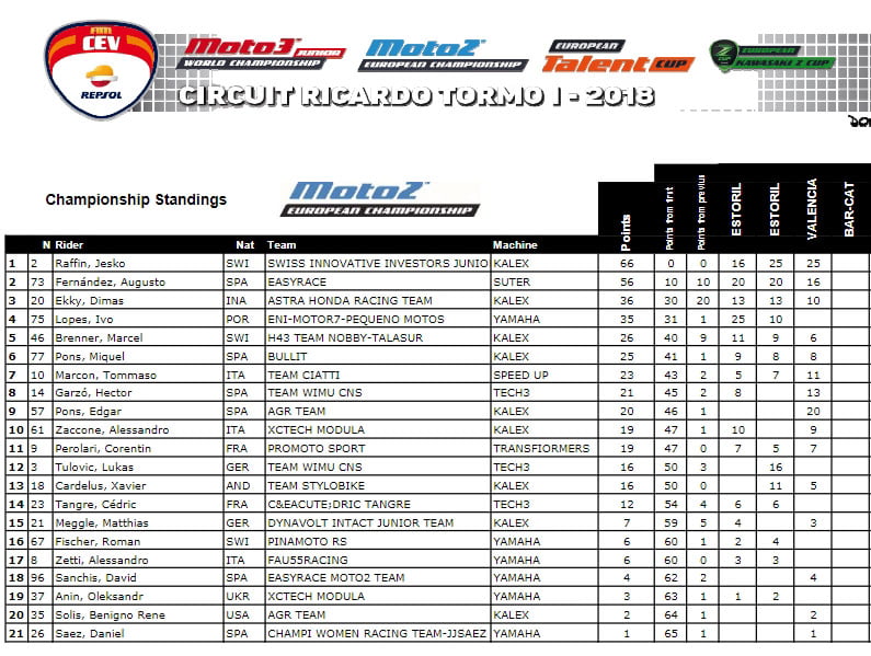 La bataille en Moto2™ est plus serrée avec Jesko Raffin en tête du classement. Le pilote suisse Innovative Investors Junior a remporté les deux dernières courses et n’a pas quitté le podium depuis son retour en Championnat d’Europe Moto2™. La menace pour Jesko Raffin s’appelle Augusto Fernandez (Easyrace), à dix points du leader, tandis que Dimas Ekky (Astra Honda Racing Team) est troisième mais 30 points derrière. Ivo Lopez (ENI-Motor7-Pequeño Motos), qui a remporté une victoire retentissante à Estoril avec sa Yamaha R6, est le leader du Superstock 600 et au classement général, il n’est qu’à un point derrière Dimas Ekky, bien qu’il ne participera pas à Barcelone.