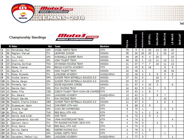 En Moto3™, Raul Fernandez se présente en Catalogne en tant que solide leader après avoir marqué trois podiums lors des quatre premières courses, et avoir accumulé 78 points contre 58 à Manuel Pagliani (Leopard Junior), deuxième. Aleix Viu (Marinelli Sniper Team) a gravi les échelons du classement général après avoir remporté sa première victoire en Moto3 lors de la dernière course du Championnat du Monde Junior au Mans alors que seule la catégorie FIM CEV Repsol Moto3 y était présente. Le coureur du Marinelli Sniper Team est troisième mais avec seulement un point d’avance sur Yuki Kunii (Asia Talent Team).