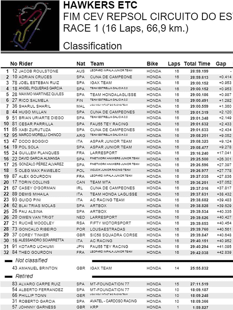 Plus de peur que de mal mais trois des leaders sont au tapis, ce dont profite le poleman Alvaro Carpe (MT-Foundation 77) pour se diriger en vainqueur vers la ligne d’arrivée, avec sans doute un peu trop d’empressement puisqu’il chute dans le dernier tour laissant la victoire à un inattendu Jacob Roulstone (Leopard Imapala Junior Team) qui fait retentir l’hymne australien sur le circuit d’Estoril. Ces courses sont toujours pleines de rebondissements…