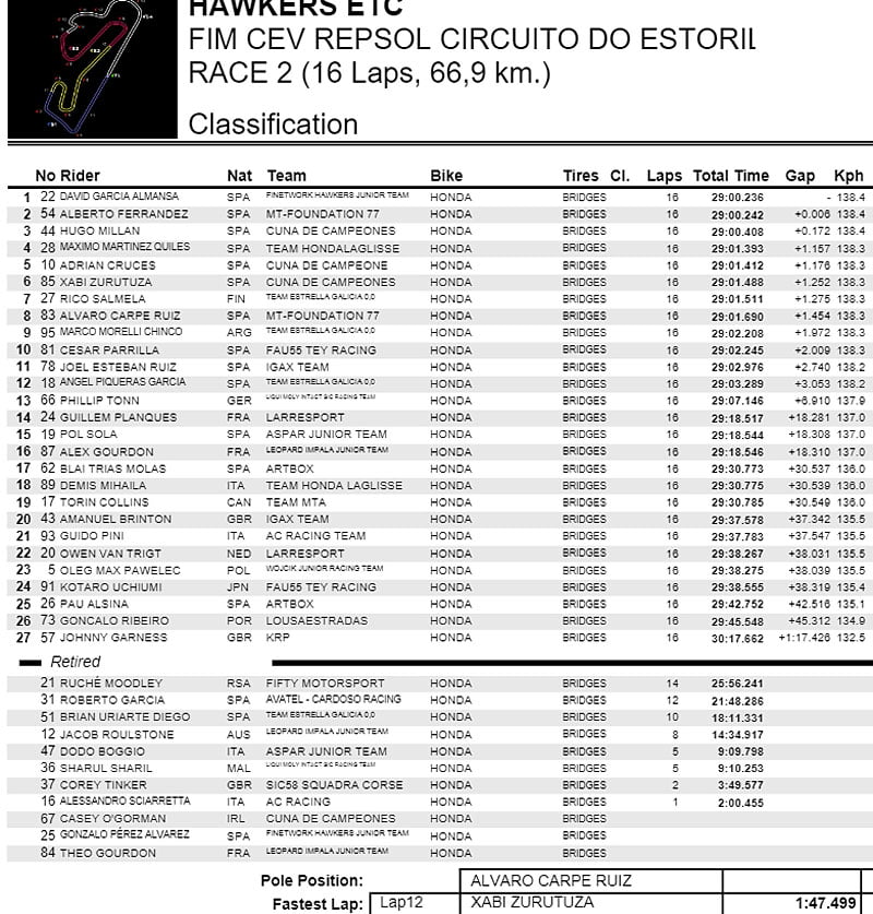 Au final, grâce à un meilleur passage dans la parabolique, c’est la Honda violette de ce dernier qui franchit in extremis la ligne d’arrivée en premier, 6 millèmes devant Alberto Ferrandez.