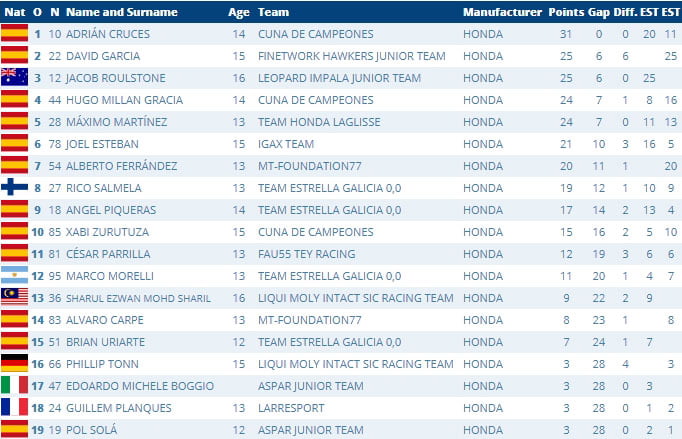 Pour rappel, tout le monde roule sur les mêmes Honda 250 Moto3 Stock équipées de pneus Bridgestone et cette catégorie sert de prélude au Championnat du Monde Junior Moto3 qui lui-même possède toutes les caractéristiques de l’antichambre des Grands Prix.