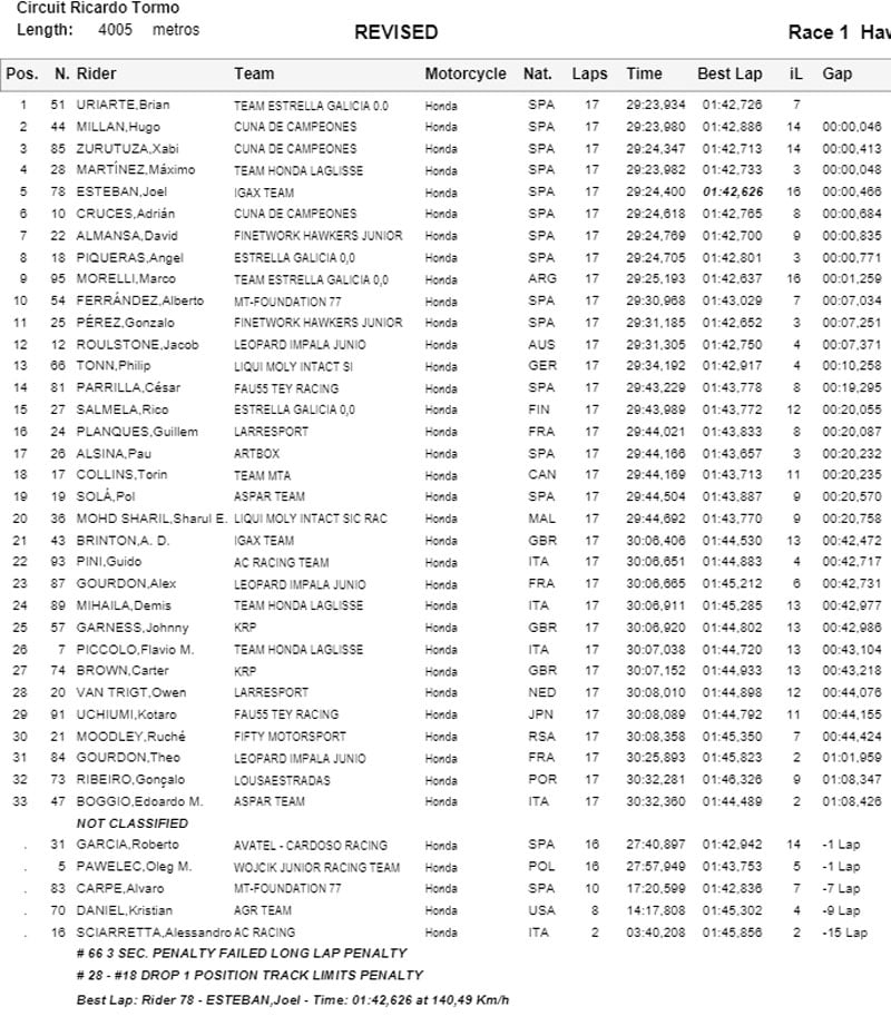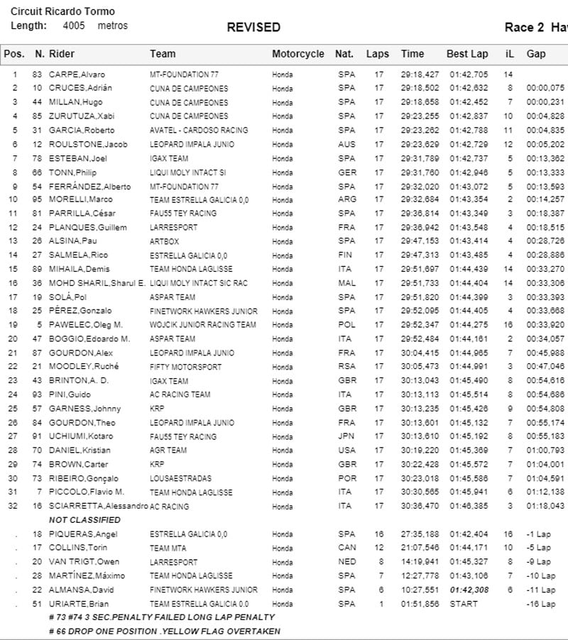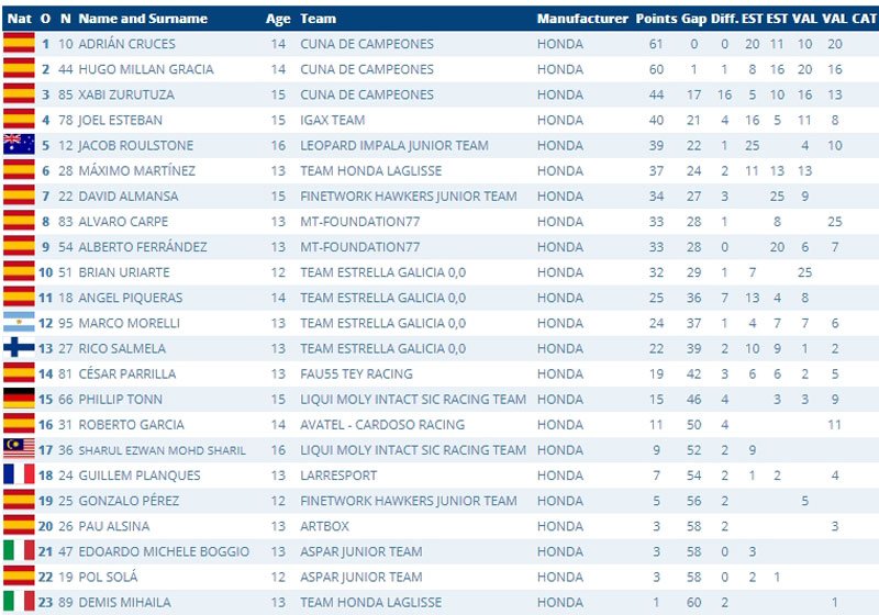 Adrian Cruces et Hugo Millan suivent leur compatriote, tandis que Angel Piqueras connaît un désastre en chutant à la sortie du dernier virage, dans le dernier tour.