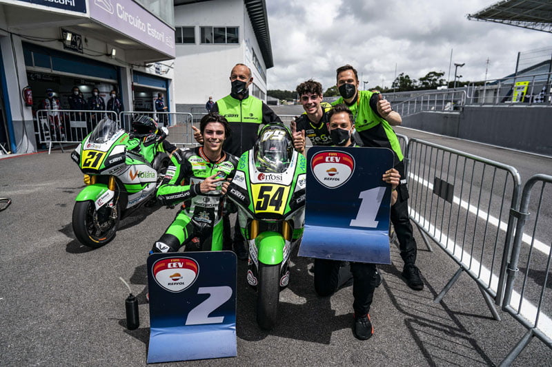 Pour l’European Talent Cup, il y a déjà eu deux vainqueurs en 2021 ; suite à la chute dans le dernier tour du poleman Alvaro Carpe (MT-Foundation 77), Jacob Roulstone (Leopard Impala Junior Team) a remporté la course 1 à Estoril, tandis que David Garcia (Finetwork Hawkers Junior Team) a remporté la course 2. Cependant, ni l’un ni l’autre ne mène le titre, cet honneur revenant à Adrian Cruces (Cuna de Campeones), dont la régularité à Estoril (deuxième dans la course 1 et cinquième dans la course 2) lui procure la tête du championnat.