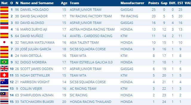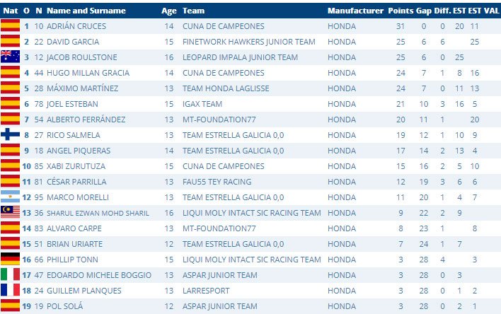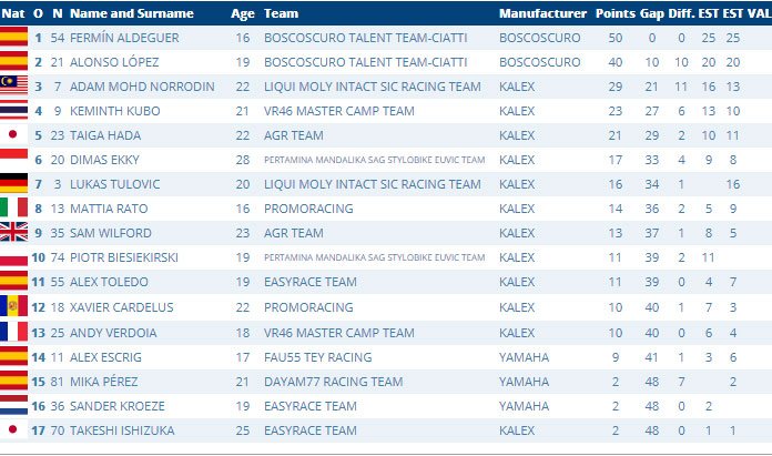David Garcia et Jacob Roulstone sont respectivement deuxième et troisième, tandis que Hugo Millan (Cuna de Campeones) et Maximo Martinez (Team Honda Laglisse) complètent le top 5. Joel Ruiz (IGAX Team) est également monté sur le podium à Estoril, tout comme l’un des favoris de la pré-saison, Alberto Ferrandez (MT-Foundation 77) ; tous deux visent la victoire lors de la deuxième manche.
