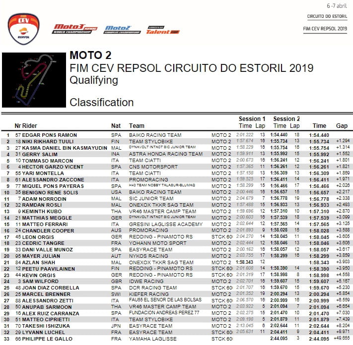 Edgar Pons (Kalex, Baiko Racing Team) a montré son dosseret de selle aux autres coureurs avec un temps de 1’54.440 en Q2, soit 1,294 secondes devant son poursuivant immédiat Niki Rikhard Tuuli (Kalex, Team Stylobike). Le pilote finlandais du team Stylobike a à son tour précédé le Malais Kasma Daniel Bin Kasmayudin (KTM, Dynavolt Intact SIC Junior Team) de 0,020 seconde. L’Indonésien Gerry Salim (Kalex, Astra Honda Racing Team) a terminé quatrième devant la Speed Up de Tommaso Marcon (Team Ciatti), tandis qu’Héctor Garzó (Tech3 Mistral, CNS Motorsport), un autre candidat au titre Moto2™, n’a terminé que sixième.