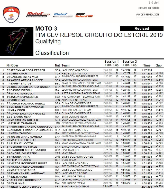 Jeremy Alcoba a confirmé ses prétentions pour le titre de Champion du Monde Junior Moto3™ en prenant la première pole position de la saison avec un temps de 1’47.214. Le pilote du team Laglisse Academy a battu l’auteur du meilleur temps de la matinée, Deniz Öncü (KTM, Red Bull KTM Ajo), de seulement 0.058 lors de la deuxième séance qualificative, avec Carlos Tatay (KTM, Fondation Andreas Pérez 77) complétant la première ligne de la grille.