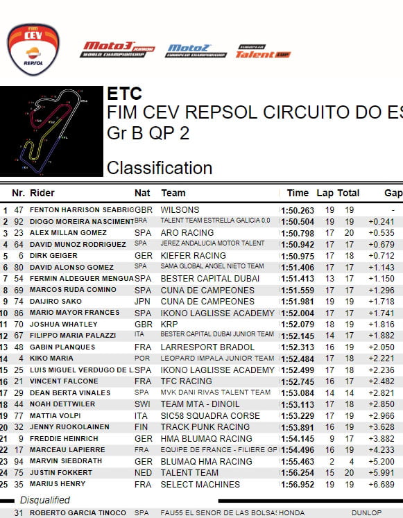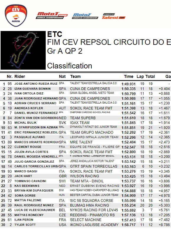 Le champion en titre de l’ETC Xavier Artigas (Honda, Leopard Impala Junior Team) mènera la deuxième ligne de la grille Moto3™ suivi de Barry Baltus (KTM, Sama Global Angel Nieto Team) et José Julián García (KTM, Fau55 El Señor de las Bolsas), bien que ces deux derniers soient déjà à 0,8 secondes du poleman. D’autres prétendants au titre comme Yuki Kunii (Honda, Asia Talent Cup) et Aleix Viu (KTM, Sama Global Angel Nieto Team) – qui a participé au dernier GP Motul de la République Argentine – ont terminé plus en arrière.