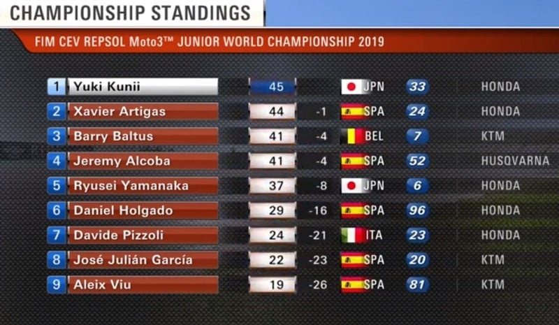 Yuki Kunii (Honda, Asia Talent Team) défendra sa position de leader de la catégorie contre Xavier Artigas (Honda, Leopard Impala Junior Team) qui ne concède qu’un seul point, ainsi que d’autres rivaux proches comme Barry Baltus (KTM, Sama Qatar Angel Nieto Team) et Jeremy Alcoba (KTM, Laglisse Academy), respectivement troisième et quatrième, tous deux avec 41 points. Ryusei Yamanaka (Honda, Junior Team Estrella Galicia 0,0) est cinquième avec 37 points.