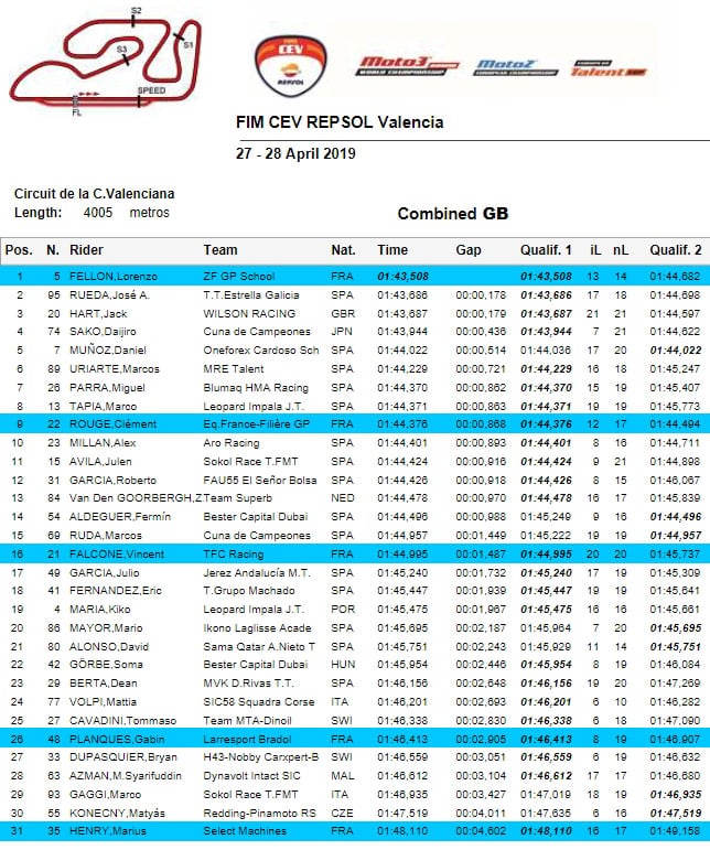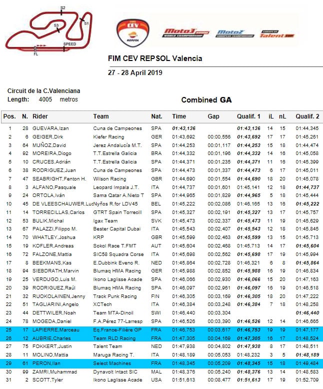 Signalons encore Marceau Lapierre (Équipe de France – Filière GP) 25e du groupe A, juste devant Charles Aubrie (Team RLD Racing) alors que Gabin Planques (Larresport Bradol) est 26e du groupe B, Ilan Peron (Select Machines) 29e du groupe A.