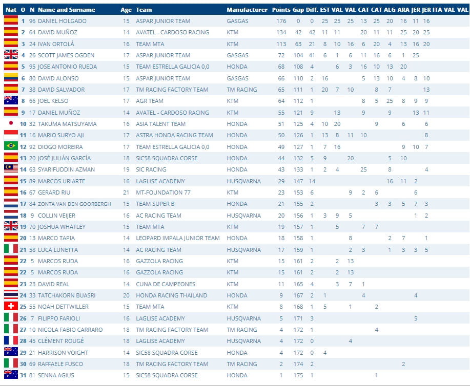 Futur pilote Tech3 en Grand Prix, Daniel Holgado (GasGas, Aspar Junior Team) arrive en Italie avec 42 points d’avance, avec une main tendue vers le trophée. S’il quitte Misano avec plus de 50 points en main, il remportera la couronne.
