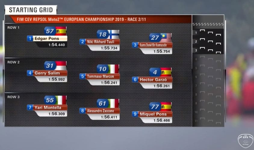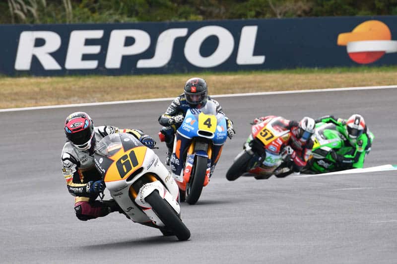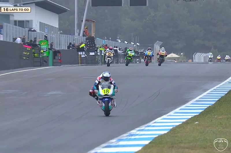 A l’extinction des feux rouges, Kasma Daniel bin Kasmayudin (Kalex, Dynavolt Intact SIC Junior Team) s’élance le mieux depuis sa 3e position sur la grille et aborde le premier virage en tête devant Niki Rikhard Tuuli (Kalex, Team Stylobike) et le pole man Edgar Pons (Kalex, Baiko Racing Team).