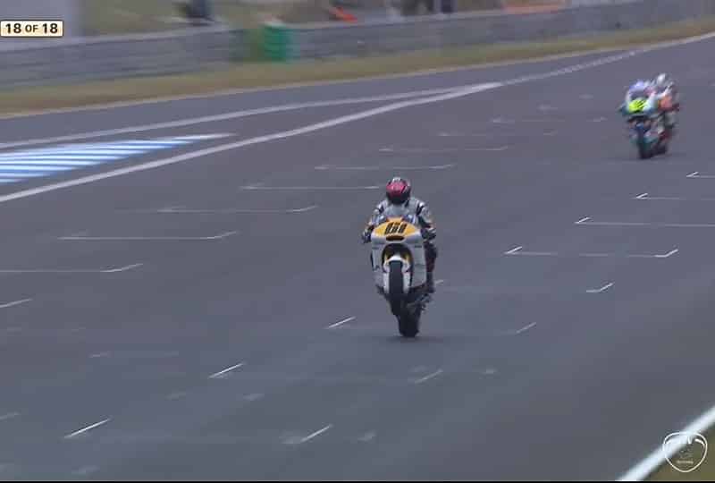 À 10 tours de la ligne d’arrivée, Hector Garzo et Niki Tuuli se font surprendre par des vibreurs encore mouillés, ce dont profite l’Italien pour s’échapper.