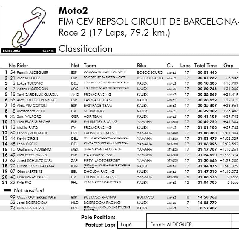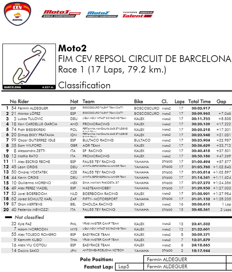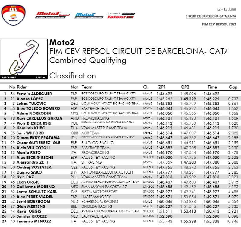 En qualifications, Fermín Aldeguer (Boscoscuro #54, Boscoscuro Talent Team – Ciatti) a acquis la pole position devant son coéquipier Alonso López (#21) et Lukas Tulovic (Kalex #3, Liqui Moly Intact SIC Racing Team), un résultat que l’on a également pu constater sur le podium des courses 1 et 2.