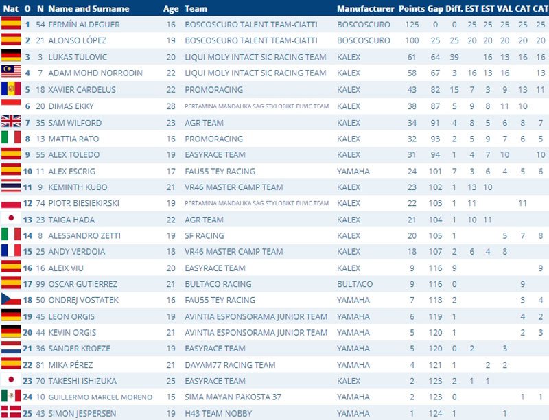 Ainsi, avec 5 victoires en 5 courses, Fermín Aldeguer possède 25 points d’avance sur son coéquipier qui a fini 5 fois deuxième : Avouez que comme suspens, on fait mieux !
