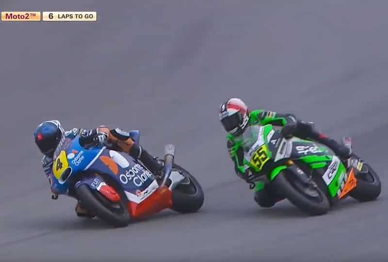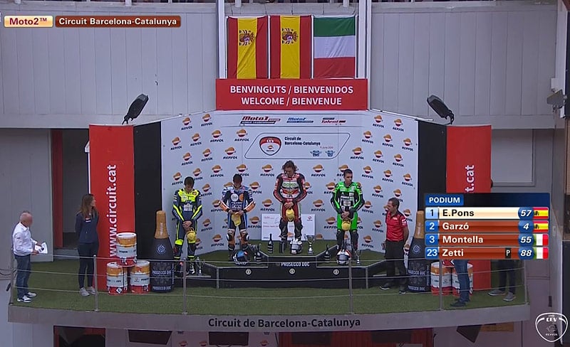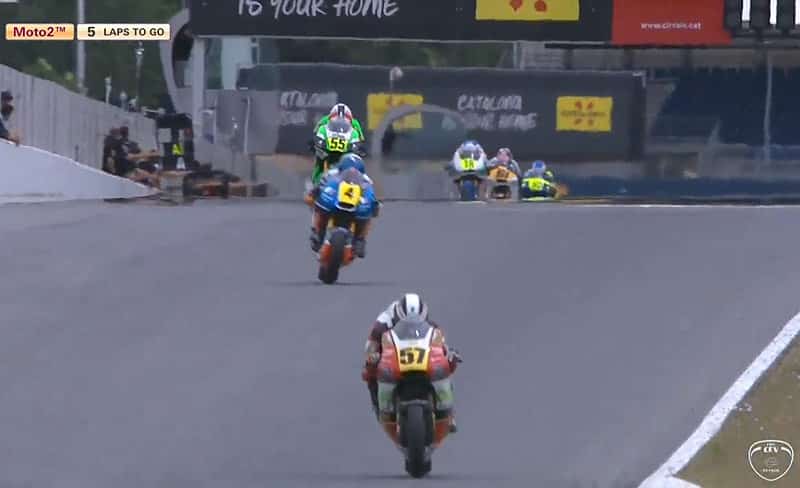 A 3 tours de l’arrivée, Alessandro Zacone (Kalex, Promoracing) perd le contrôle de sa Kalex dont le réservoir s’enflamme mais la course n’est pas interrompue.