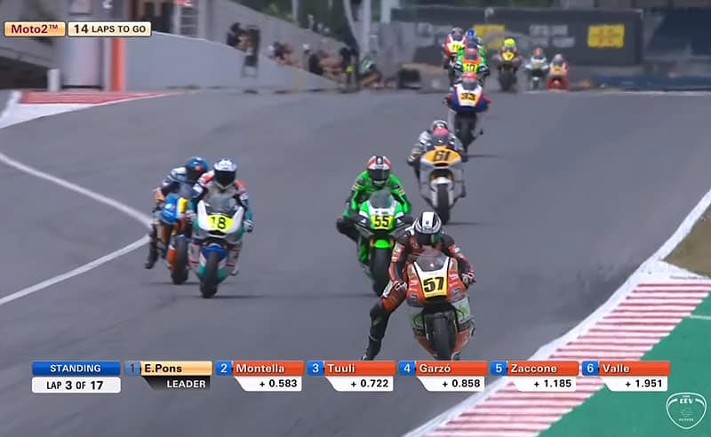 Après un tour, Hector Garzo (Tech3, CNS Motorsport) se bagarre pour la 3e place, ce dont profitent Edgar Pons et Yari Montella pour prendre un peu d’air.