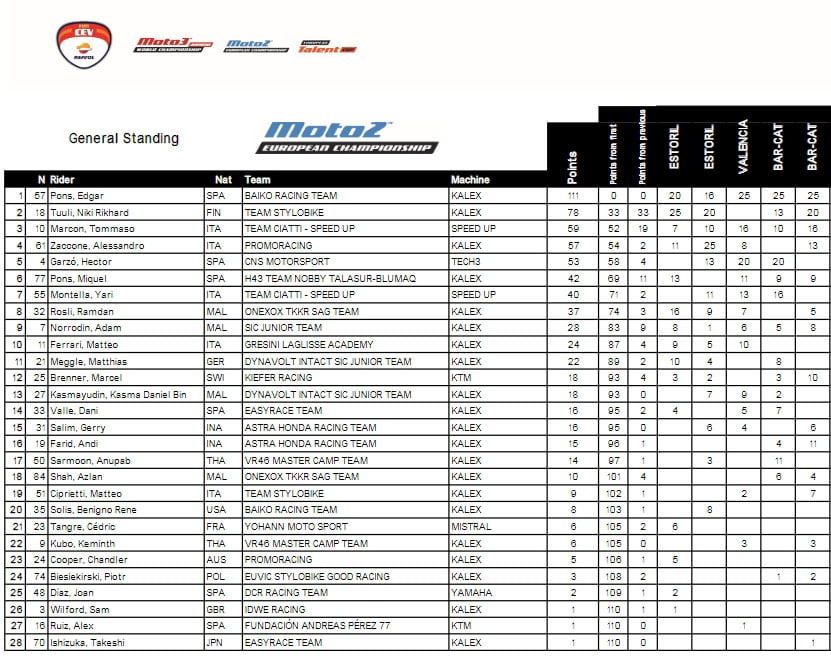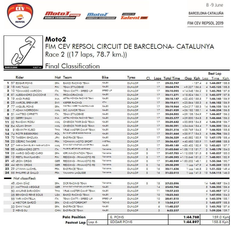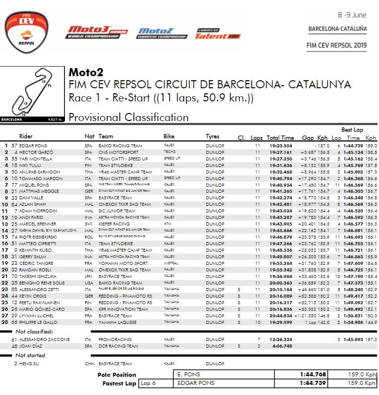 Après un long nettoyage de l’asphalte, la course repart pour 11 tours, toujours avec un départ impérial d’Edgar Pons (Kalex, Baiko Racing Team), cette fois devant Niki Tuuli (Kalex, Team Stylobike) et Yari Montella (Speed Up, Team Ciatti).