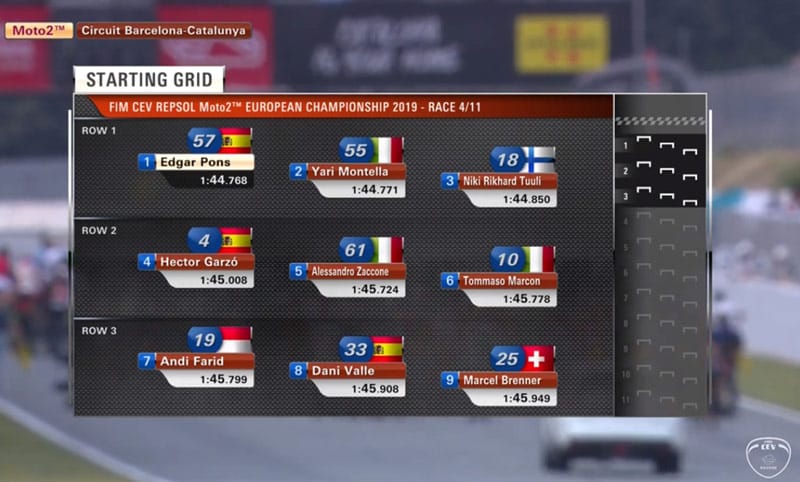 A l’extinction des feux rouges, le poleman Edgar Pons (Kalex, Baiko Racing Team) laisse tout le monde sur place et franchit le premier virage loin devant Hector Garzo (Tech3, CNS Motorsport) très bien parti de la 2e ligne.