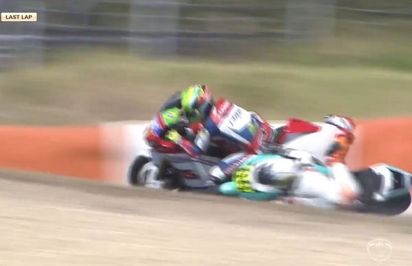 A l’extinction des feux, le poleman Lukas Tulovic (Forward Junior Team) effectue un excellent départ et précède au premier virage Eric Granado (Promoracing), Steven Odendaal (NTS SportsCode T. Pro) et un Héctor Garzó (Team WiMu CNS, Mistral Tech3) surgit comme un boulet de canon depuis la 3e ligne. A l’inverse, Ricky Cardús (Team Stylobike) s’est fait enfermer.
