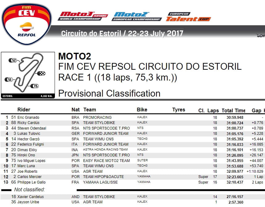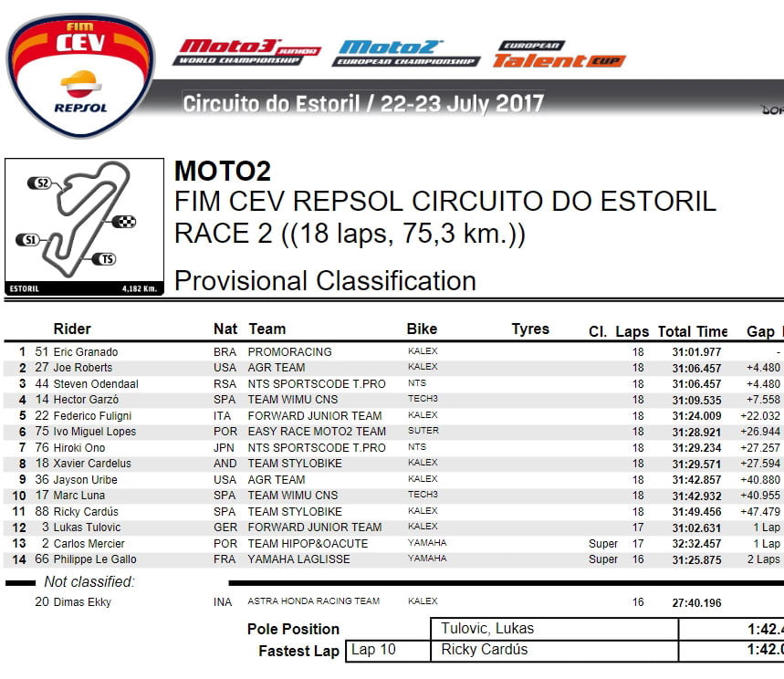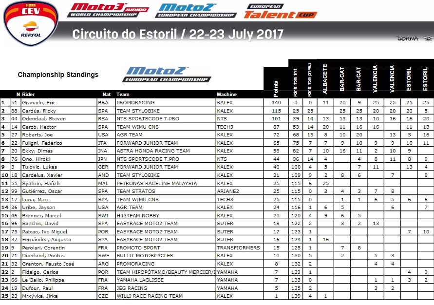 Au championnat, Eric Granado (Promoracing, Kalex) mène maintenant de 5 points devant Ricky Cardús (Team Stylobike, Kalex) alors que le troisième, Steven Odendaal (NTS SportsCode T. Pro, NTS) possède 81 points.