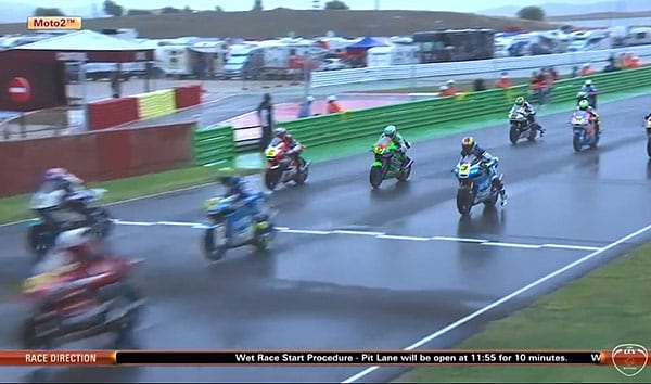 La pluie a cessé pour la 2e course Moto2 de la journée. Les pilotes partent en slicks sur une piste qui comporte encore de nombreuses zones d’humidité.