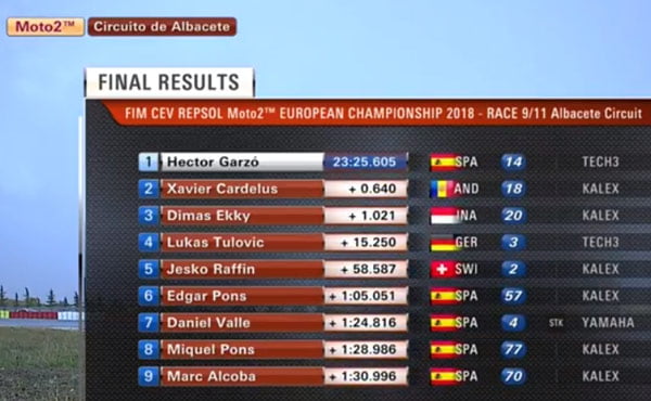 Cependant, la pluie redouble et Hector Garzo n’a pas dit son dernier mot : il produit son effort à 3 tours du drapeau à damier. En moins d’un tour, il parvient à revenir sur le leader, à le doubler, et à conserver un avantage de 6 dixièmes jusqu’au baissé du drapeau, inscrivant ainsi sa première victoire en championnat d’Europe FIM CEV Moto2.