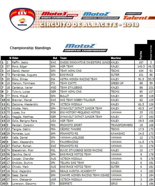 Au championnat, Jesko Raffin possède maintenant 48 points d’avance sur Edgar Pons, ce qui laisse toujours à ce dernier une infime possibilité mathématique de se battre pour le titre.