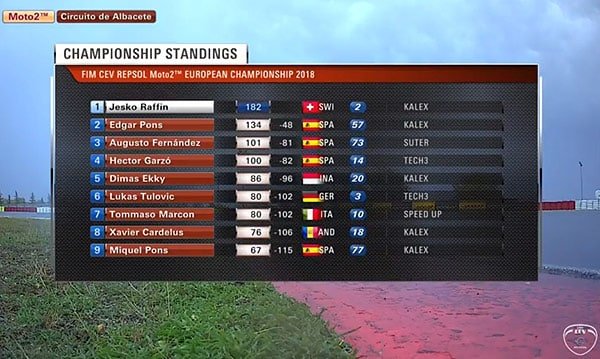 Avec le seul rendez-vous du 25 novembre à Valence à effectuer, cela apporte mathématiquement un titre de champion d’Europe à Jesko Raffin, après celui de champion d’Espagne Moto2 obtenu en 2014.