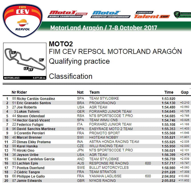 Derrière lui, à 2 dixièmes le matin, la séance la plus rapide, et 4 dixièmes l’après-midi, on trouve le Brésilien leader du championnat Éric Granado (Kalex, Promoracing) et l’Américain Joe Roberts (Kalex, Tean AGR). Cardus se ne possédant que 20 points de retard sur Granado, les deux courses de dimanche revêtent une importance cruciale pour l’attribution du titre 2017.