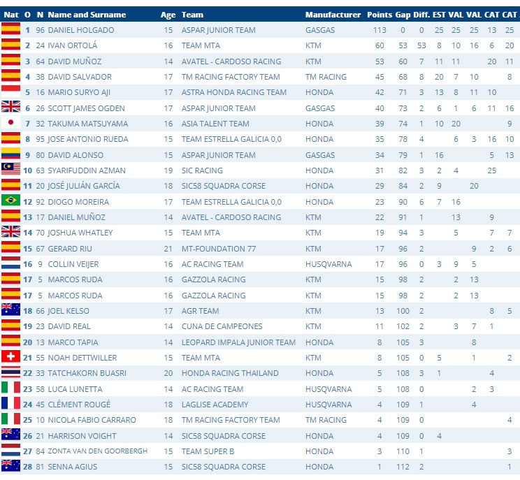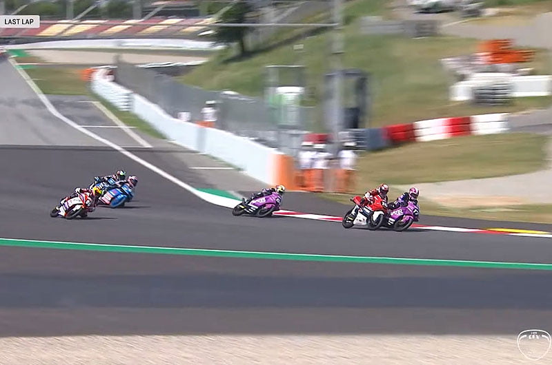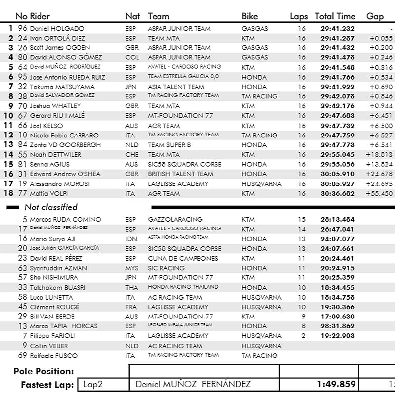 Daniel Holgado, sans réelle surprise, après avoir laissé Iván Ortolá (KTM, Team MTA), deuxième du championnat, mener jusqu’au dernier passage sur la longue ligne droite du circuit de Barcelone, moment où le pilote d’Alicante profitait de l’aspiration pour prendre la tête et conserver le commandement durant le dernier tour.