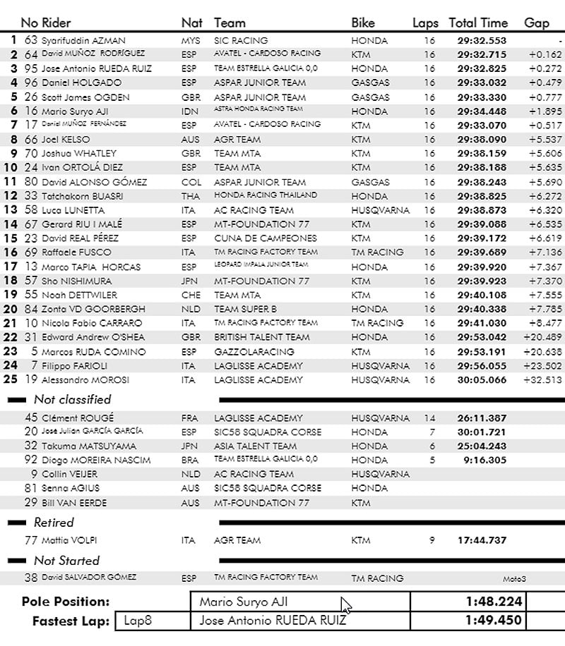 Le Malaisien Syarifuddin Azman  (Honda, SIC Racing) tirait finalement les marrons du feu devant l’impétueux Daniel Muñoz et Jose Antonio Rueda, Daniel Holgado terminant in fine quatrième après avoir élargi au virage 10.