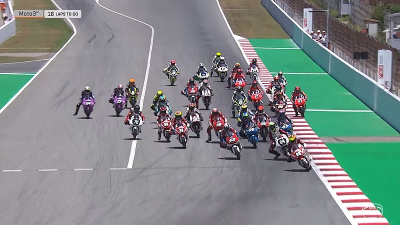 A l’extinction des feux rouges, on pensait pourtant que les choses allaient rentrer dans l’ordre avec le départ foudroyant d’un Daniel Holgado qui prenait la tête des hostilités avant le premier virage. C’était sans compter sur la fougue des 33 autres pilotes qualifiés qui ne mettaient que quelques courbes avant de malmener le leader provisoire. Dès le début de la course de 16 tours, le poleman Mario Aji et Takuma Matsuyama portaient des coups de boutoir à la domination de l’Espagnol, bientôt relayé par Daniel Muñoz (KTM, Avatel-Cardoso Racing).