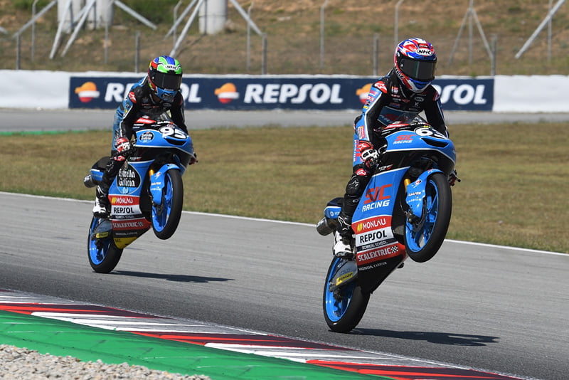 Une des nouvelles est que Diogo Moreira (Honda, Team Estrella Galicia 0,0) est sur la grille de départ avec son bras gauche en écharpe, en tant que « Umbrella boy »pour son coéquipier Jose Antonio Rueda. L’incident de la course 1 a laissé des traces, pour le jeune Brésilien et l’épreuve catalane s’est terminée prématurément…
