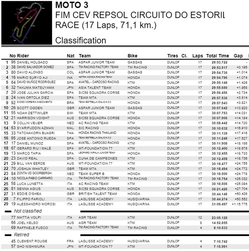 La saison de Daniel Holgado (Aspar junior Team) commence de la meilleure façon. Le jeune pilote du Team Aspar a remporté sa première victoire de la saison, triomphant sur le circuit d’Estoril sur la moto GasGas, qui enregistre ainsi son premier succès historique en vitesse. Grande satisfaction pour TM grâce à David Salvador (TM Racing Factory Team), toujours en lutte dans le groupe de tête et deuxième au drapeau à damier. Pas mal aussi pour la troisième marche du podium : nous parlons du prometteur Colombien David Alonso (Aspar junior Team), champion ETC en titre qui fait ses débuts dans le championnat du monde Moto3 Junior cette année avec l’équipe de Jorge Martínez. Première course de la saison plutôt compliquée pour les pilotes italiens : le meilleur est Nicola Carraro, 24ème devant le rookie Luca Lunetta.