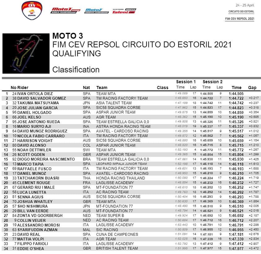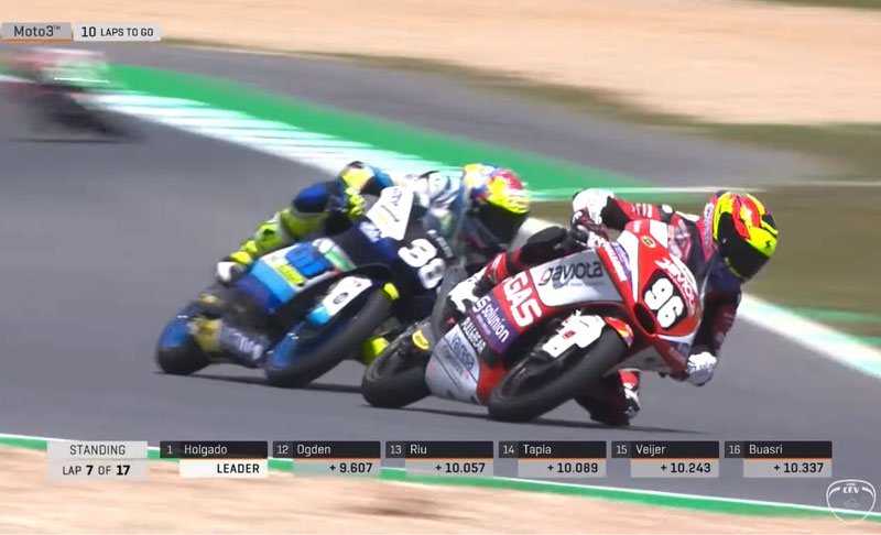 Ils sont deux dans la course à la victoire, mais sont quatre pour la dernière marche du podium, à savoir Takuma Matsuyama (Asia Talent Team), Jose Garcia (SIC58 Squadra Corse), David Muñoz (Avatel – Cardoso Racing) et Ivan Ortolá (Team MTA). Dans les derniers tours, cependant, cinq pilotes se battent pour la tête, avec David Alonso (Aspar junior Team) et Mario Aji (Astra Honda Racing team) qui reviennent, suivis de Diogo Moreira (Team Estrella Galicia 0,0)et du poleman un peu plus loin. Filippo Farioli (Laglisse Academy) recevait en revanche une pénalité de long tour pour trop de sorties de piste, confirmant le départ difficile de nos porteurs… En tête, la lutte était serrée, jusqu’à ce que Daniel Holgado puisse accumuler les dixièmes nécessaires pour s’assurer de la première victoire de 2021. Superbe deuxième place pour David Salvador sur TM, le troisième est le rookie David Alonso.